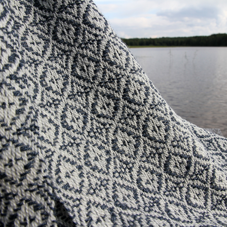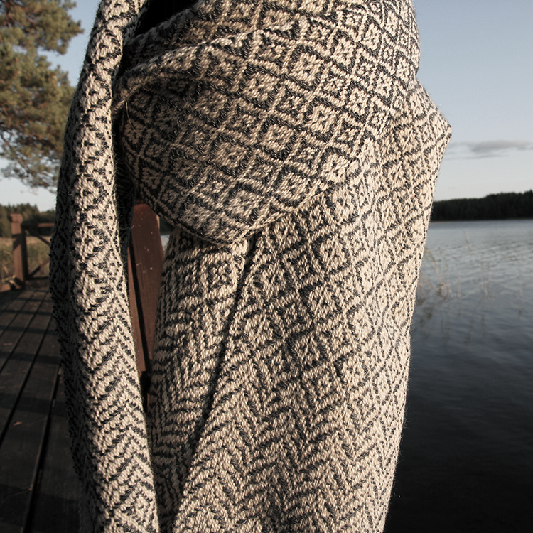Materiaali: Silkki, alpakka ja villa. Kudelangan silkki on Italiasta, alpakka Perusta ja langan on kehrännyt ja värjännyt norjalainen tuottaja. Loimilanka on norjalaista villalankaa, vaaleanharmaata kampalankaa.
