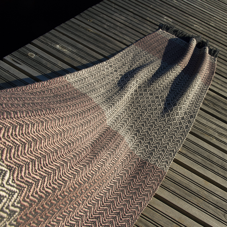 Materiaali: Silkki, alpakka ja lampaanvilla. Kudelangan silkki on Italiasta, alpakka Perusta ja langan on kehrännyt ja värjännyt norjalainen tuottaja. Loimilanka on norjalaista villalankaa, tummanharmaata kampalankaa.