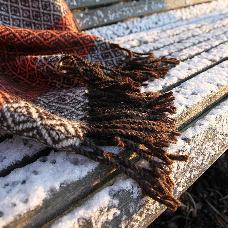 Ruskainen on kokonaan suomenlampaan villaa. Sen loimi on luonnonmustaa ja kuteen oranssi on värjätty veri- ja verihelttaseitikeillä. Taipuisa ja lämmin huivi sopii kokonsa puolesta niin hartiahuiviksi kuin näyttäväksi takkihuiviksikin.